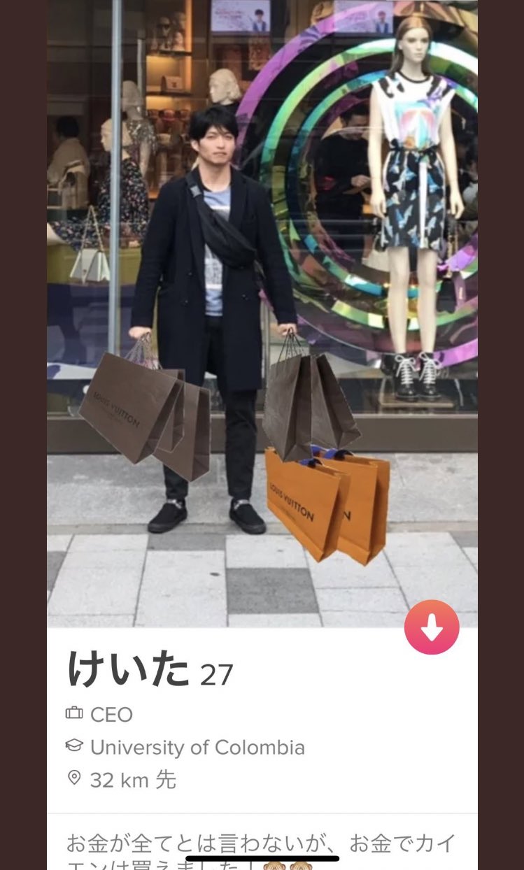滝沢ガレソ On Twitter 紙袋がどうみても全部合成の見栄っ張りtinderお兄さん がタイムラインに流れてきたのですが これは去年の 4月頃に話題になった人です 目線を入れてないverを置いておきます