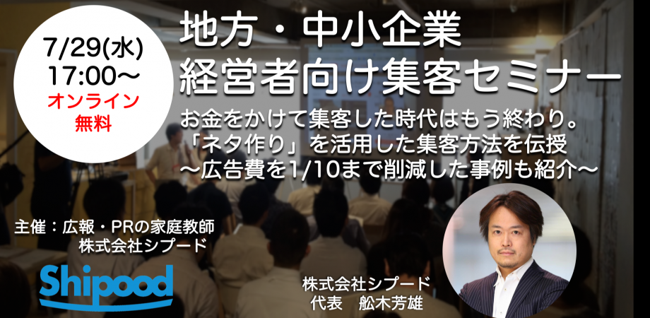 7 29 水 17時 無料オンライン 地方 中小企業経営者向け集客セミナー お金をかけて集客 した時代はもう終わり 120社を支援してきた広報 Prのプロが教える ネタづくり とは 年間広告費を1 10に削減 ネタづくり で集客に成功した飲食店運営企業ゲイト社の事例を
